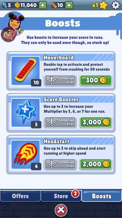 2、商店可购买技能和道具。玩家们在游戏中会收集众多金币,可以利用这些金币到游戏商店中购买技能和道具,道具主要有加速、磁铁、滑板等。