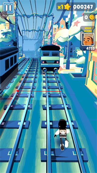 5、通过双击屏幕来启动滑板,滑板会持续一段时间。在没有滑板的情况下,角色撞到火车或者障碍等都会被抓住,游戏终结。但在有滑板的状态下,角色就有了一道保险,撞到火车等的时候,滑板会消失,游戏可以继续进行。