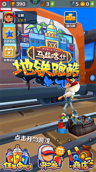 1、打开地铁跑酷游戏,点击左上角的设置按钮。