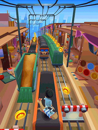 地铁跑酷马拉喀什版是地铁跑酷的全新篇章,也是八周年版本。游戏玩法简单轻松,画面精致炫酷,故事发生在来往地铁的隧道上,角色在地铁站台随处涂鸦,惹恼了地铁内的执勤人员,然后就开始抓捕杰克,杰克需要躲避地铁轨道上的栏杆以及随时会迎面冲来的地铁,玩家的任务就是帮助游戏主人公躲过抓捕以及越过一路上的障碍,玩家在这里将享受最棒的视听盛宴,3D立体视觉体验,快来和我一起奔跑吧。