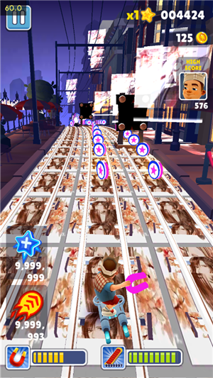 2、游戏中,玩家需要在道路上奔跑、跳跃、闪避障碍物,同时还要注意收集金币和道具,比如加速、磁铁等;玩家需要利用这些道具来更好地过关;