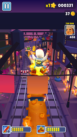 4、随机应变沉着应对,学会默数滑板的消失时间,以及优化跑酷路线(何时放开的捡道具、金币,何时选择安全路线为主)不要顾此失彼。