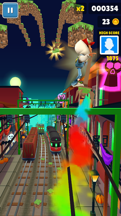 5、通过双击屏幕来启动滑板,滑板会持续一段时间。在没有滑板的情况下,角色撞到火车或者障碍等都会被抓住,游戏终结。但在有滑板的状态下,角色就有了一道保险,撞到火车等的时候,滑板会消失,游戏可以继续进行。