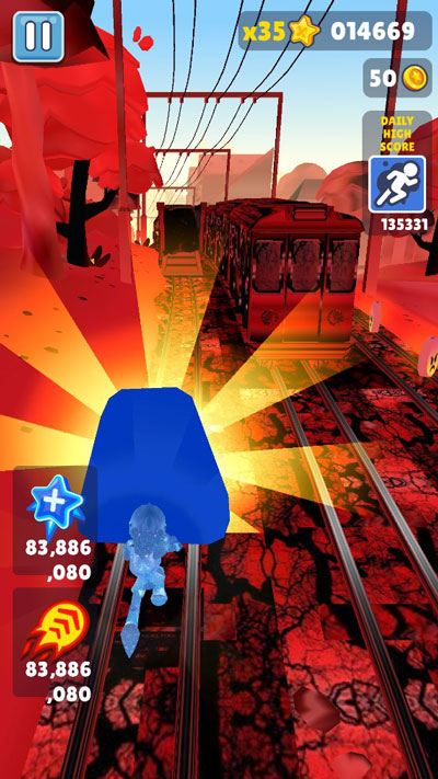 地铁跑酷熊大8.0版本是地铁跑酷的魔改版之一,这个版本修改了无限金币钥匙,还提供众多炫酷的皮肤供玩家选择,游戏中的跑道变成了暗红色,金币也变成了愤怒的表情,让跑酷过程变得更加刺激。在玩法和原版差不多,玩家只需要左右滑动屏幕来控制角色移动即可,在跑酷的同时要注意前方疾驰而来的列车,还要收集沿途出现的金币,遇到随机出现的道具时也不要错过,在不同道具的帮助下,你的跑酷里程将会变得更长,除了可以在游戏中捡拾道具,玩家还可以去商店中购买“双倍积分”、“隐身”等等道具,有了这些道具的帮助,游戏将会变得更加轻松,如果你很喜欢地铁跑酷这款游戏又想体验与原版不同的画面场景,那么不妨来试试这款地铁跑酷熊大8.0版本。