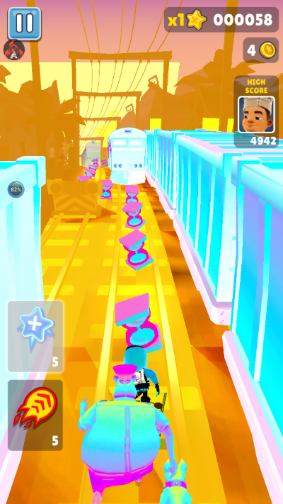 有地铁也会有隧道,中间有一根柱子,左右两边无规律会有火车奔过来,这个时候就要考验玩家的应变能力。在前期的时候过个隧道表示毫无压力,后期30W分过后经常有玩家出现手指反应不及时然后被撞死的现象。对于过隧道的技巧,眼疾手快是前提,关键是心态要放平静,这样才不会手滑。