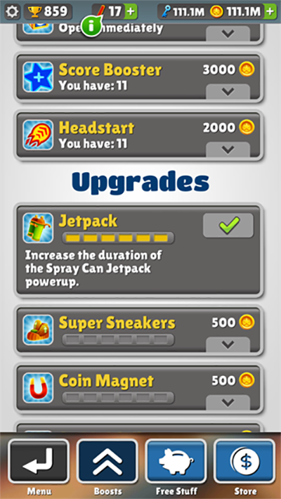 5、建议技能先升级喷射器,可以刷金币且安全时间更长;超级跳鞋和滑板在喷射器状态下是暂停计时的;
