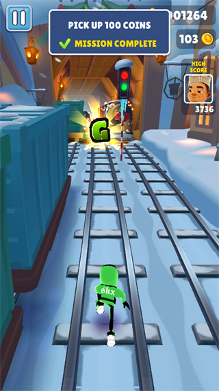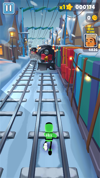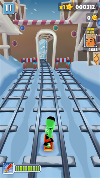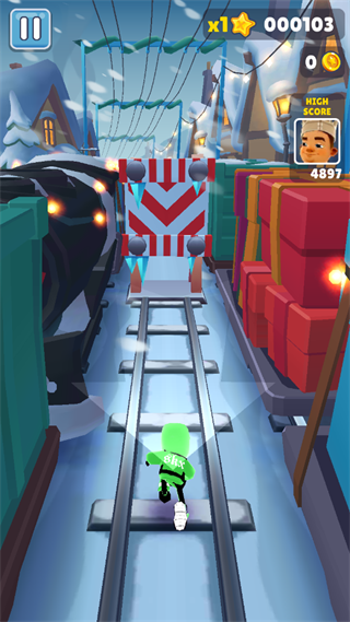 5、通过双击屏幕来启动滑板,滑板会持续一段时间。在没有滑板的情况下,角色撞到火车或者障碍等都会被抓住,游戏终结。但在有滑板的状态下,角色就有了一道保险,撞到火车等的时候,滑板会消失,游戏可以继续进行。