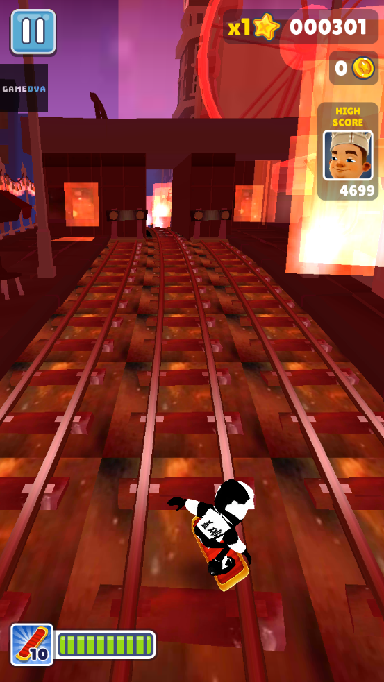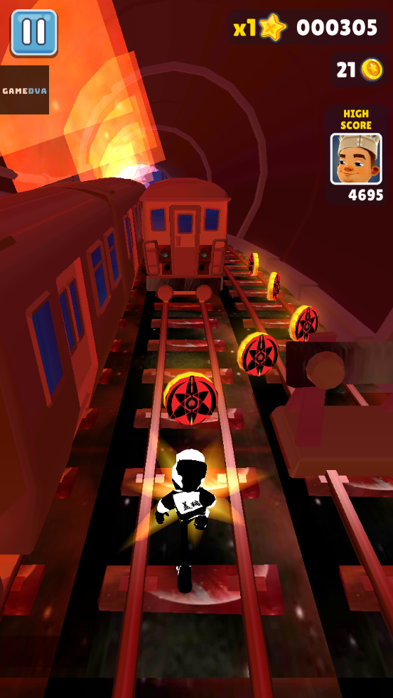 地铁跑酷盖瑞日落2.0版本是一款经过魔改后的地铁跑酷游戏,整体色调偏红色,金币变成了也变了模样,但是玩法还是跟原版相似,玩家需要上下左右滑动屏幕来控制人物,以便躲避前方的障碍物以及迎面开来的火车,还得防止被后方的人追上。不过在跑酷的同时,玩家还要收集路面上的带有图案的金币,这些金币可以在商店中购买你想要的道具,合理使用可以发挥很大的作用,比如跑鞋、助推器、跳跃道具等,特别是跳跃道具,可以跳到上方吃到金币,但是下落时,需要及时变更方向,不然会撞死。