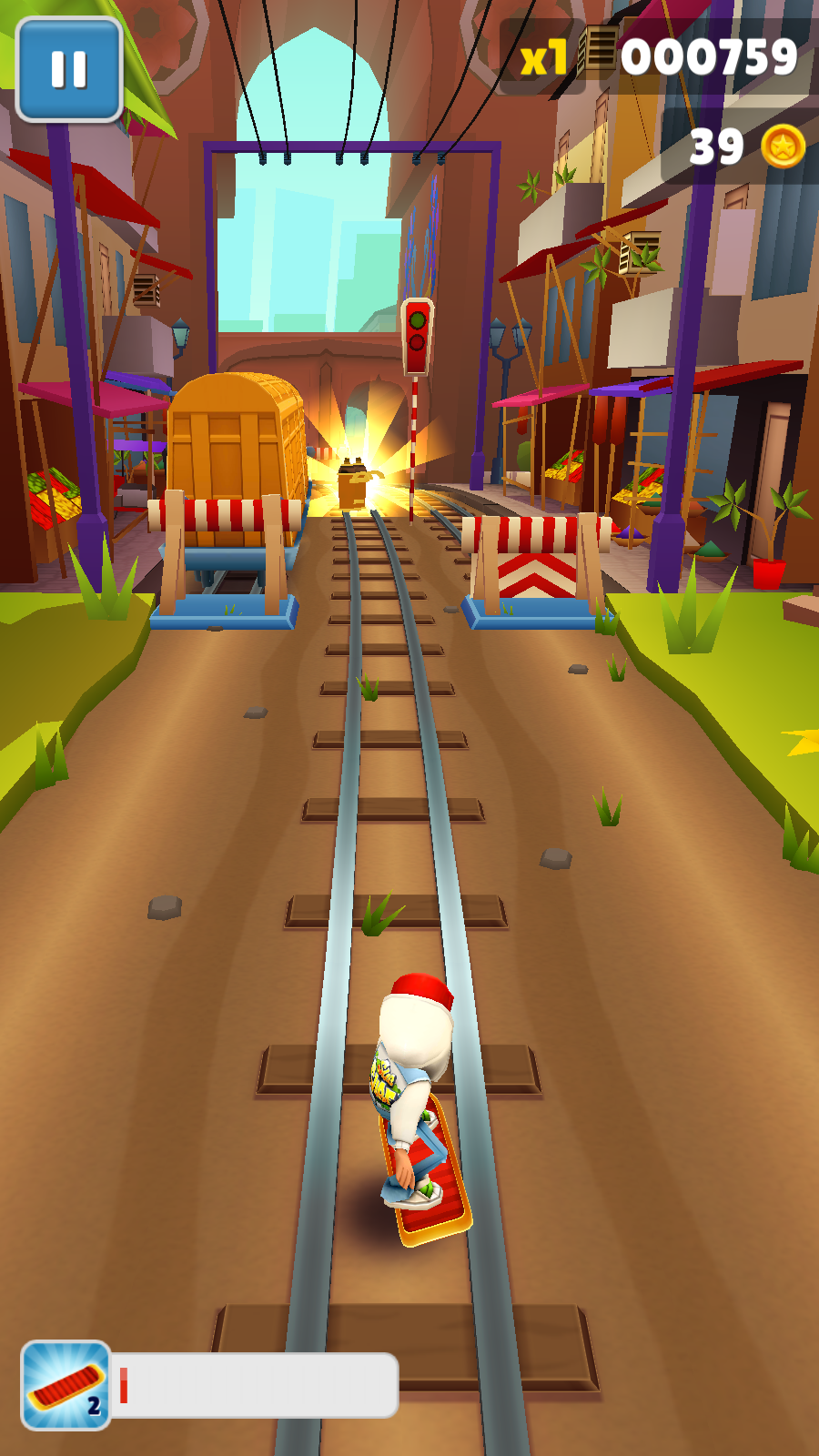 没有跳跃鞋从轨道上火车,在有路障的情况下,掌握好跳起的落点,在路障的上方下拉,使角色落在路障上可以再次跳起,然后就可以跳上火车顶了,相信大家都遇到过有个收集物品在火车上,却拿不到而错过的尴尬,掌握了这个技巧,问题迎刃而解。