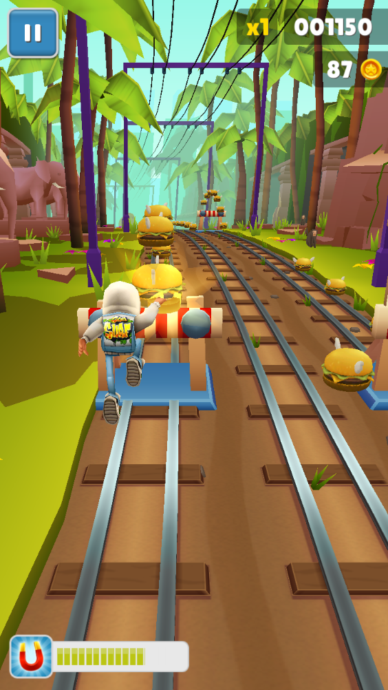 地铁跑酷汉堡金币版本是一款很有趣的跑酷类游戏,拥有高品质的游戏画面和音效,使得游戏更加立体和丰富,金币也变成了汉堡模样,为游戏增添了许多的趣味,场景设置在地铁隧道中,玩家需要通过左右滑动屏幕来控制游戏角色的移动方向,并在地铁隧道中奔跑、跳跃、滑行、闪避障碍物以及收集金币来获得高分。玩家还可以利用收集到的金币购买不同角色的皮肤、各种新的道具、技能以及强化物品,帮助你更好地进行游戏,感兴趣的话快来下载体验吧~