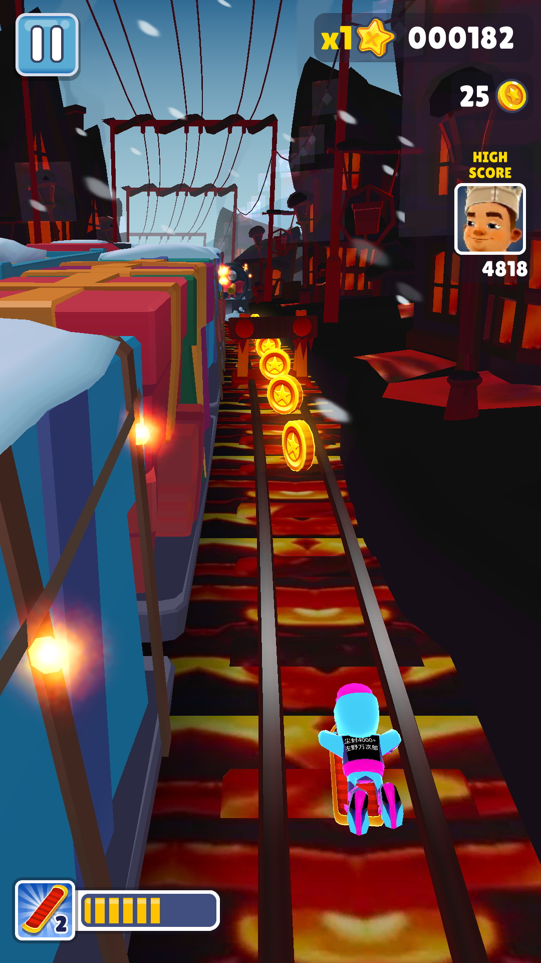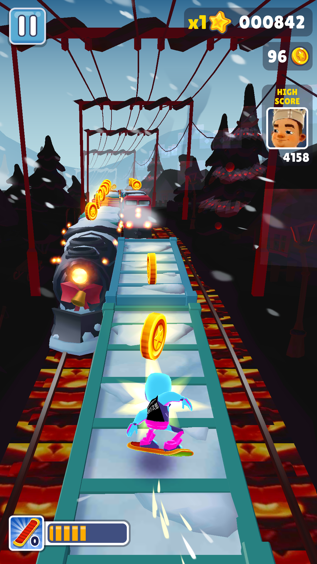 地铁跑酷万次郎14.0版本是个国内大神魔改的创意游戏,整体风格超炫酷,地图是雪地风搭配岩浆铁轨,冰火两重天的感觉直接拉满。角色和皮肤也换成了带有作者专属标识的设计,蓝紫黑配色特别帅气。玩法主要是跑酷,玩家需要不断奔跑、跳跃、滑行和闪避各种障碍,体验感很刺激。