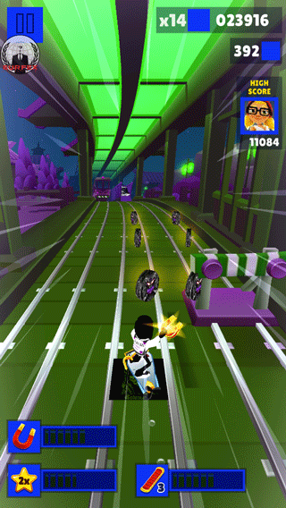 3、游戏中的道具分为主动和拾取的道具,主动道具滑板可以帮助你增加得分,还能保护你,拾取的道具有很多种,每一种都有不同功能。