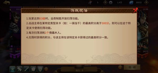 2.出战主将在某特定类型关卡(如一骑当千)的最高积分高于500分,则可以在这个特定关卡使用扫荡功能。