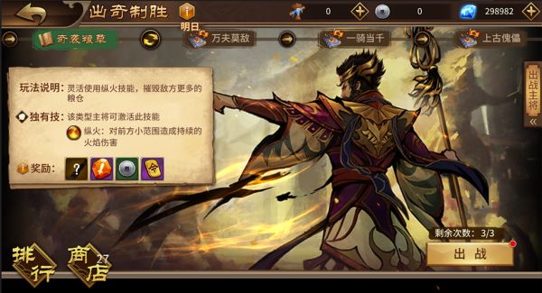 其次,赤壁之战是一个非常详细的副本玩法,分为单人和组队两种模式,玩家可以在不同难度层次中挑战,获取丰富的奖励。而“出奇制胜”则是另一种多关卡挑战玩法,每天随机生成十个关卡,玩家需要根据不同的关卡类型选择合适的武将出战,获得积分越高奖励越丰厚。