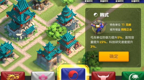 所以推荐22堡之后换成韩式文明,韩式文明除了能扩充医院容量15%之外,还能提升研究速度3%。