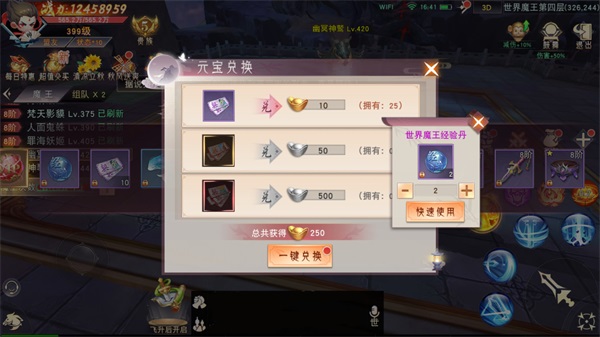 提到魔王,可以大多数人第一个想到的就是爆装备,其实每一个魔王被击杀以后都会掉落经验丹,并且不受魔王类型的限制,无论是世界魔王,还是专属魔王,或是其他领域中的魔王,都能获得大量经验。在爆装备的同时还可以顺带升级,岂不是美滋滋?必做等级:★★★★☆
