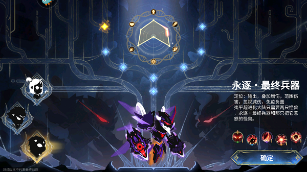 这款游戏的三大基础怪兽分支分别是混沌、传说和逆转,每个分支都有不同的定位。比如“永逐·最终兵器”是伤害叠加型输出,“万象·神剑古拉姆”则是全体增功型输出。最高级觉醒怪兽像“破魂暴君”和“创晓”也非常霸气。