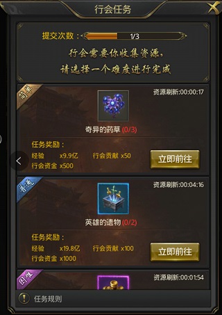 每天每个成日可完成三次行会任务,在暗域一层采集相应道具提交即可完成。可以进行采集的道具有三种,分别为:奇异的药草、英雄的遗迹、散落的金器,从左往右道具越稀有,同时上交后的收益也越高。但是需要注意的是,暗域一层为中立地图,不同行会的成员是可以相互PK的哦!