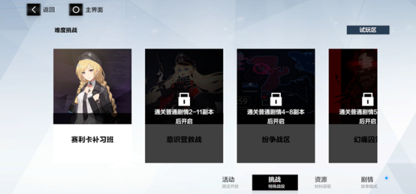 挑战关卡一共有五种关卡,分别是赛利卡补习班,意识营救战,纷争战区,幻痛囚笼,黄金之涡。接下来我会分别介绍:
