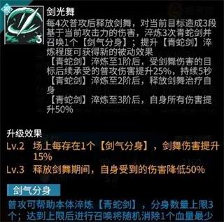小青的被动是她比较核心的技能,三阶淬炼分别带来剑舞易伤、剑舞治疗、增伤效果。小青普攻四次后将释放剑舞,剑舞淬炼3次青蛇剑并召唤一个【剑气分身】,【剑气分身】存活的情况下,每次普攻也能帮助小青进行淬炼青蛇剑,极大地缩短了青蛇剑升阶的时间。