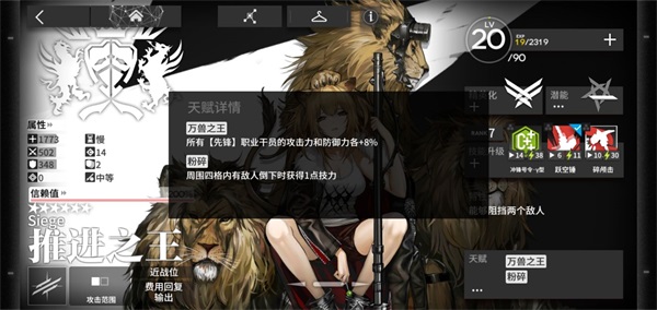 天赋简要分析:提高范围内干员一定值的物抗,能够在某种意义上对其起到防止暴毙的可能;加快自身的治疗频率,也是某种意义上防止干员暴毙的可能出现