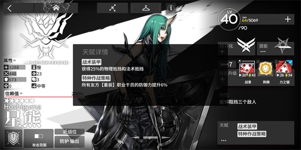 天赋简要分析:队伍中携带的重装越多,效果越明显,单带则可视为自身的物抗能力提升;概率格挡即概率免伤,在面对高压时能够一定程度上缓解我方医疗的压力,但由于触发概率并不算高,因此主要还是看中运气成分