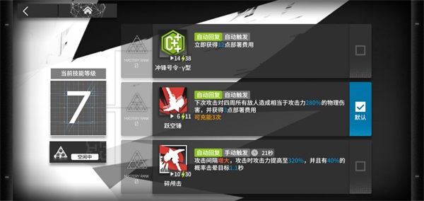 训练室:对已7级技能的干员进行技能专精。