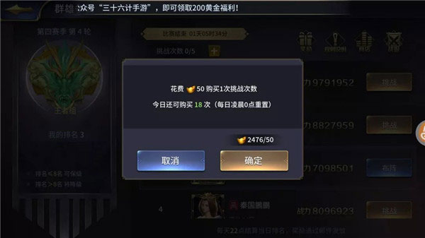 5、这是最重要的,就是群雄争霸购买挑战次数,得军饷,兑换平民神将司马懿。个人建议每轮每天购买次数30次,一周大概两轮比赛,差不多4000黄金,如果黄金有限,可适当减少。因为,司马懿是平民PK的唯一希望。成型之后,运气好的话,还可以利用司马懿偷进群雄争霸512强。拿八阵图碎片。40片,几百块的,兄弟们