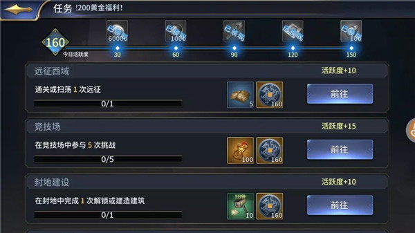 1、日常任务,每天把日常任务做到150活跃度可以获得100黄金,一周700黄金。