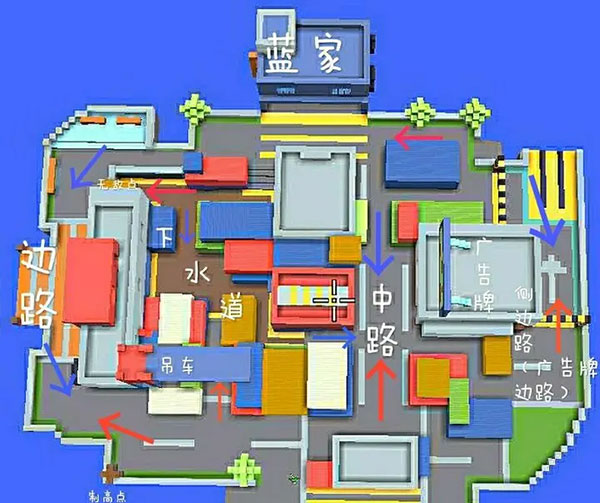 蓝方因地处高处,地形较高,有多个上房点位,属于优势的进攻方,如果你是蓝方的队员,那么你可以暗自窃喜了,处在蓝方就等于掌握了主动权,作为进攻方,有以下几条路线。