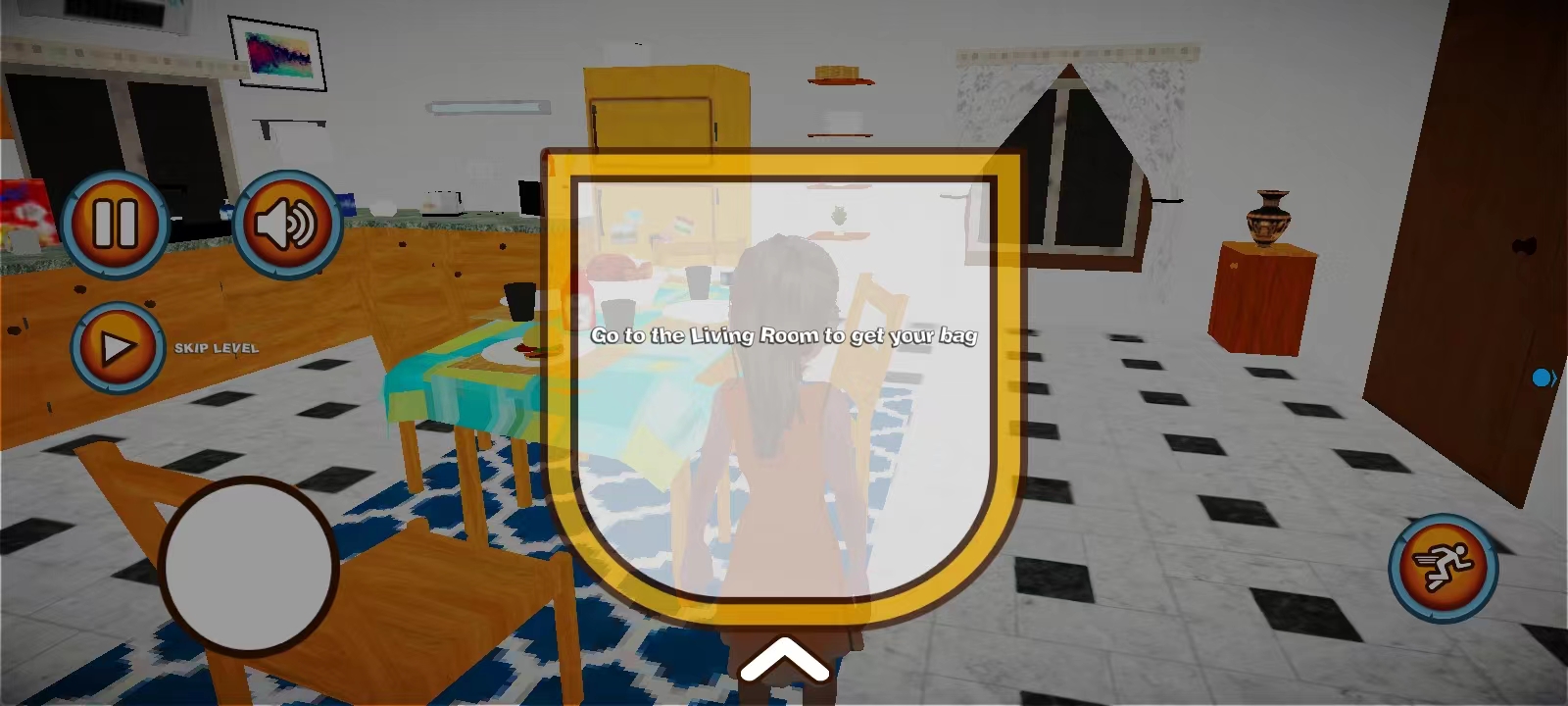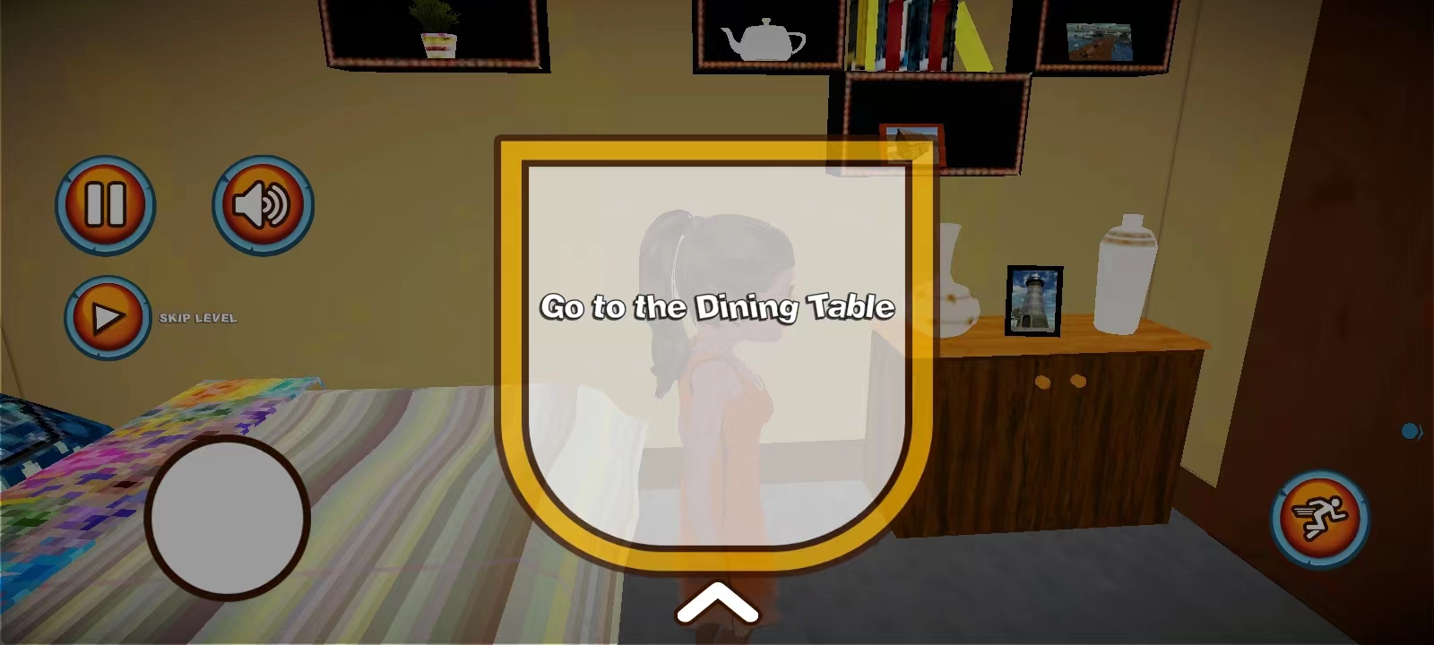 5、进入游戏以后,左边控制角色移动,而点击右边的按钮,角色就会加速;接着就会出现一个任务,比如说下图这个——去餐桌;如果不知道餐桌在哪里,可以依据右边那个蓝色的点,会带你找到;