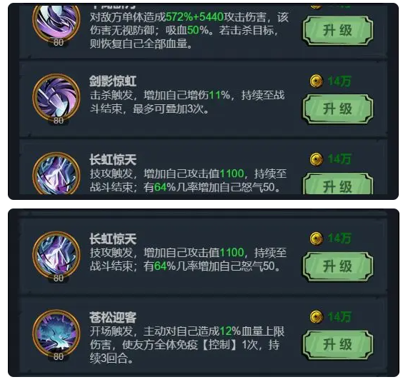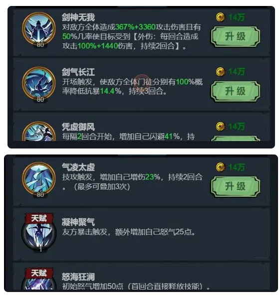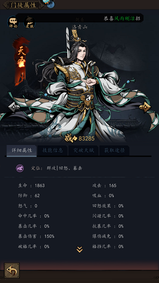 洛青山为队伍提供主要输出,主动技能全体高额AOE伤害,还附送外伤buff,被动增加自己闪避,提高自身生存能力,非常好用,队友暴击会增加自己怒气回复,释放技能会增加自身伤害,还减少敌方抗暴率,暴击强力输出,怒气回复,保证每回合必开大,剑神无我你值得信赖