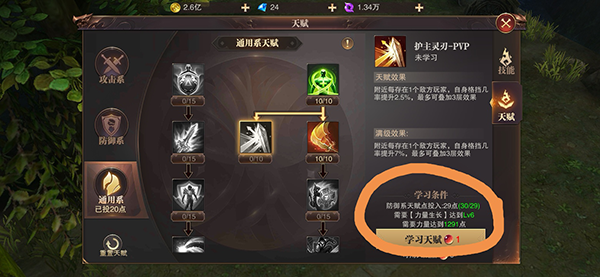 其实天赋没有大家想象的那么复杂,所有职业优先选择防御跟通用,请你注意看天赋的第二排的学习条件。