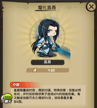 首先我们还是来看一下时装的效果,限量版时装,看起来就是高大上,很尊贵!价钱598更是刷新了时装价格的记录。而效果增加20速,也很实用。重点在于特殊效果:技能必然发动,并对目标相邻弟子造成60%的技能伤害。每次触发技能可永久增加5%攻,该效果最多叠加4层。技能变必然了,神马情况?!而且不光技能变必然了,还附带了溅射效果!这属性也真的是对得起这个价格了!