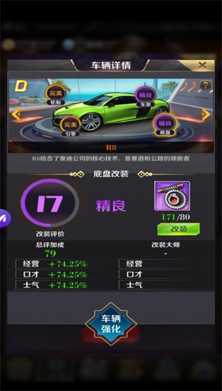 车子只有达到30级,并且是橙车以上颜色的车子,才可以进行改装。 改装分为四个部件。分别是轮胎,引擎,车架,底盘。每个部分改装又分为五个等级。分别是粗糙,瑕疵,精良,完美和绝世,改到越后面战力加成越高,见下图