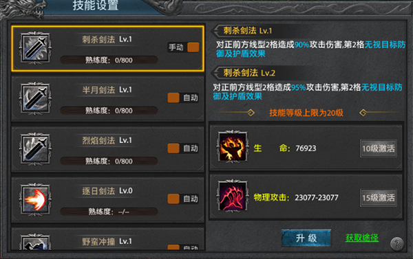 战士拥有刺杀剑法、半月剑法、烈焰剑法、逐日剑法、野蛮冲撞、无情怒冲、龙爪手、护体罡气、魔法盾、星陨火雨、十步一杀、施毒术、火龙召唤技能。