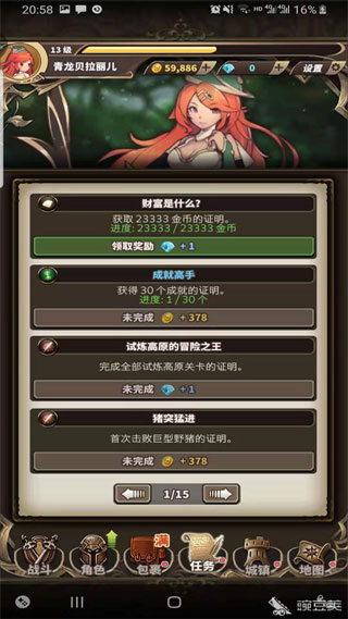除此之外我们还有任务系统,在任务系统界面可以看到所有的任务,不过不能一件自动完成,一般都是通关类的,只需要完成对应的关卡就可以获得任务奖励了,还是比较简单的。