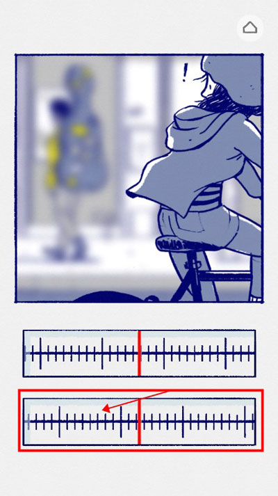 2、故事开头,小女孩看到后面有车来了,画面很不清晰,让我们把上面的刻度向右滑,直至肉眼看着最清楚的那个位置,一般都为刻度的最长的那根线或者中间的那根线,下面那个刻度尺向左滑,整个画面都高清后,就会进入下个画面。