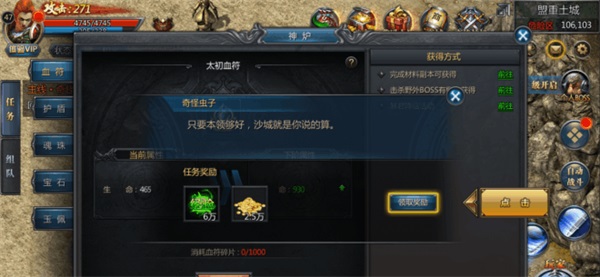 6、公会与探宝:尽量早些加入进公会,公会仓库可以换取自己所想要的装备,尽快地提升自己的攻击力,如果想要升级快的话那就把探宝的转生装备存工会仓库,然后你就有积分换取60-80的装备来回收经验,武器和衣服就不要再回收了,没有首饰来得划算。