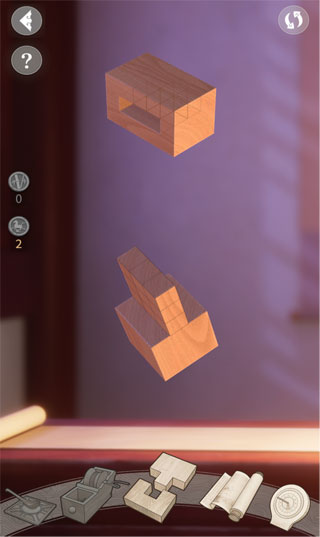以第一个关卡为例,画面中“榫”结构与“卯”结构分别将位于屏幕的上下两端,只需点击屏幕上方的物件,二者将会进行切换,在空白处滑动手指则能旋转位于屏幕中间的物件。