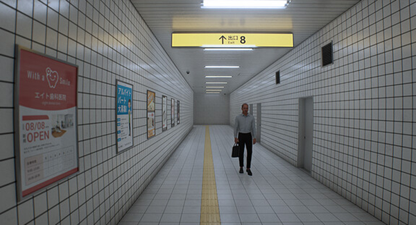 上方是排列整齐的白灯,有黄色的8号出口标识,标识后写着“地下广场”。