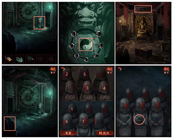 18、切换到二更场景,将【胭脂盒】放到木偶戏台上,拿到【梆子】,获得需要红线的提示。将【梆子】放到黑无常手里,用【锣棒】依次敲击锣、梆子、锣,切换到三更场景(无常贴脸高能)。点击进庙,点击元宝上的机关,解开机关拿到【一串铜钱】。