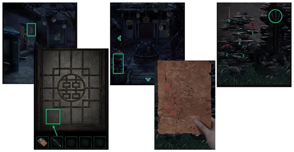 23、到左边场景过剧情,点击窗户,用【红圆珠笔】捅破窗户后,从崔婉莺手里拿到【线索纸】。点击院子的假山,根据【线索纸】的提示,按顺序点击假山上的物件,拿到【三叉戟】。