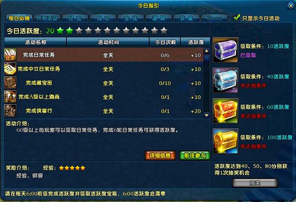 参与游戏中各种任务、副本、活动等获得的活跃度,可以用于兑换活跃度宝箱,活跃度越高,宝箱奖励也越高!