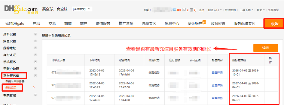 请您前往卖家后台→我的DHgate→设置→平台使用费→缴费记录,查看是否有缴费记录,如有最新记录则表示充值成功;如无记录建议查看是否有同时注册或经营的店铺,请前往检测是否充值到其他店铺