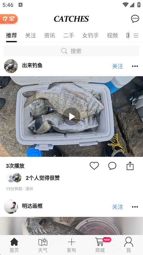 1、在本站下载并安装软件后打开,注册登录后进入软件首页,在首页可以看到系统推荐的各种视频、资讯和钓友分享;