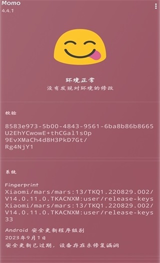 momo检测环境是一款检测手机是否处于root状态或是Xposed框架的软件,以免用户在手机的使用过程中在不知情的状态下开启了ROOT权限或是安装了Xposed框架,帮助用户了解手机情况。软件的目的仅限于检测,并不反对开启ROOT权限以及安装Xposed框架,当用户检测到手机安装了相应程序但不再需要时,点击一键清除即可轻松消除对应程序,大幅度的提升手机使用安全。