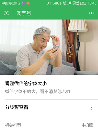 5、调整文字大小,父母基本都有些老花的情况,默认的字体大小对于他们不便于查看,这里也介绍了微信字体大小的设置和阅读模式下放大文字;