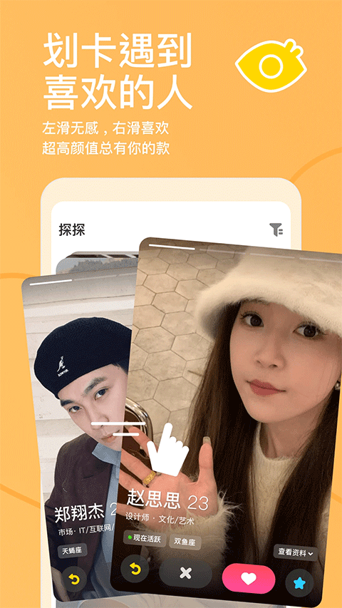 探探是一款很受欢迎的交友软件,它通过地理位置、性别偏好和距离等信息为你推荐附近的人。你可以用滑卡的方式快速表达喜欢或无感,如果两个人互相喜欢就会直接匹配,开启一段有趣的互动。没成功也不用担心,平台上年轻人很多,总能找到合适的。