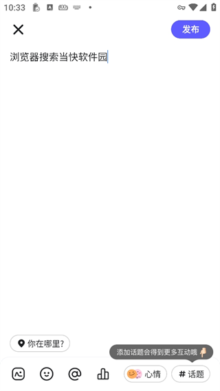 2、将内容输入后,你还可以添加图片、表情、音乐、话题等等,完成后点击发布即可。